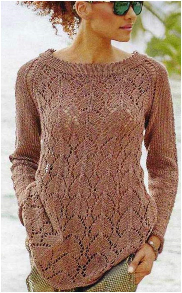 Knit in the same way, only for bevel raglan in every 2 r. reduce only 18 (23) x by 1 p. by special reduction and, in addition, to cut the neck through 27 cm = 62 p. (31.5 cm = 72 p.) From the end of the openwork pattern 1, set aside the middle 22 (25) p. And finish both sides separately.